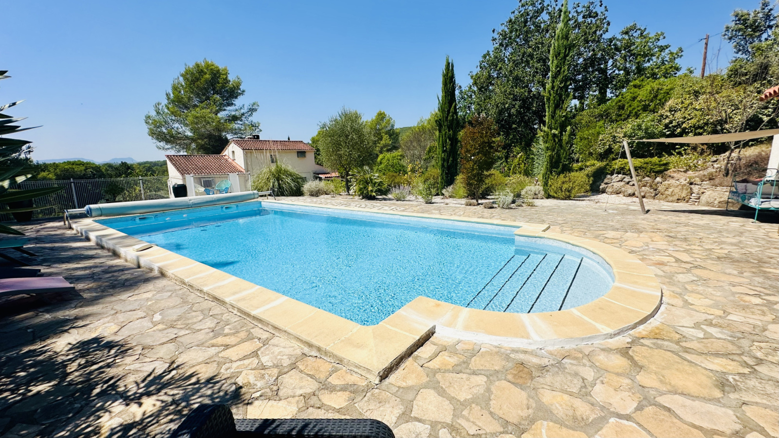 Une superbe piscine 10 x 5 avec une large plage dallée, complétée par un grand pool-house, surplombent la propriété, permettant de profiter pleinement du paysage, de la quiétude, et de la nature environnante (local technique avec pompe neuve).