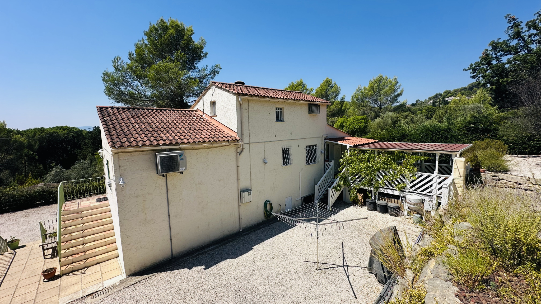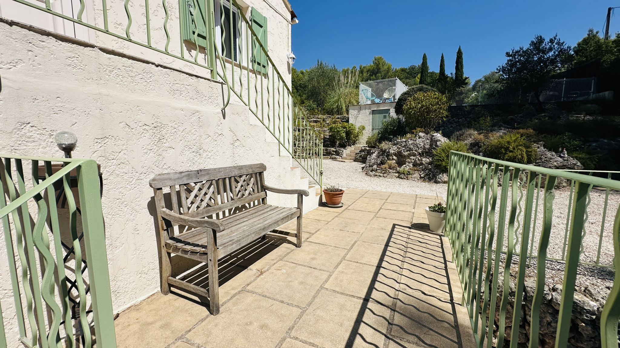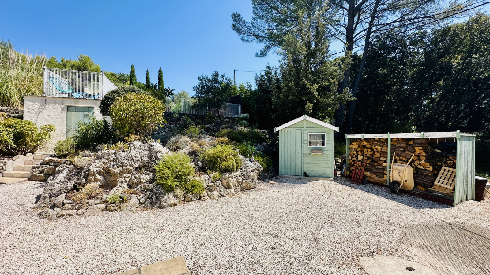La parcelle, d'une superficie de 1564 m2, offre de beaux espaces paysagers, répartis en restanques aménagées de belles pierres, avec plusieurs places de stationnement gravillonnées, une terrasse à chaque niveau, des rampes au sol pour un accès aisé, un garage, un carport, un portail électrique, un bûcher et un cabanon.