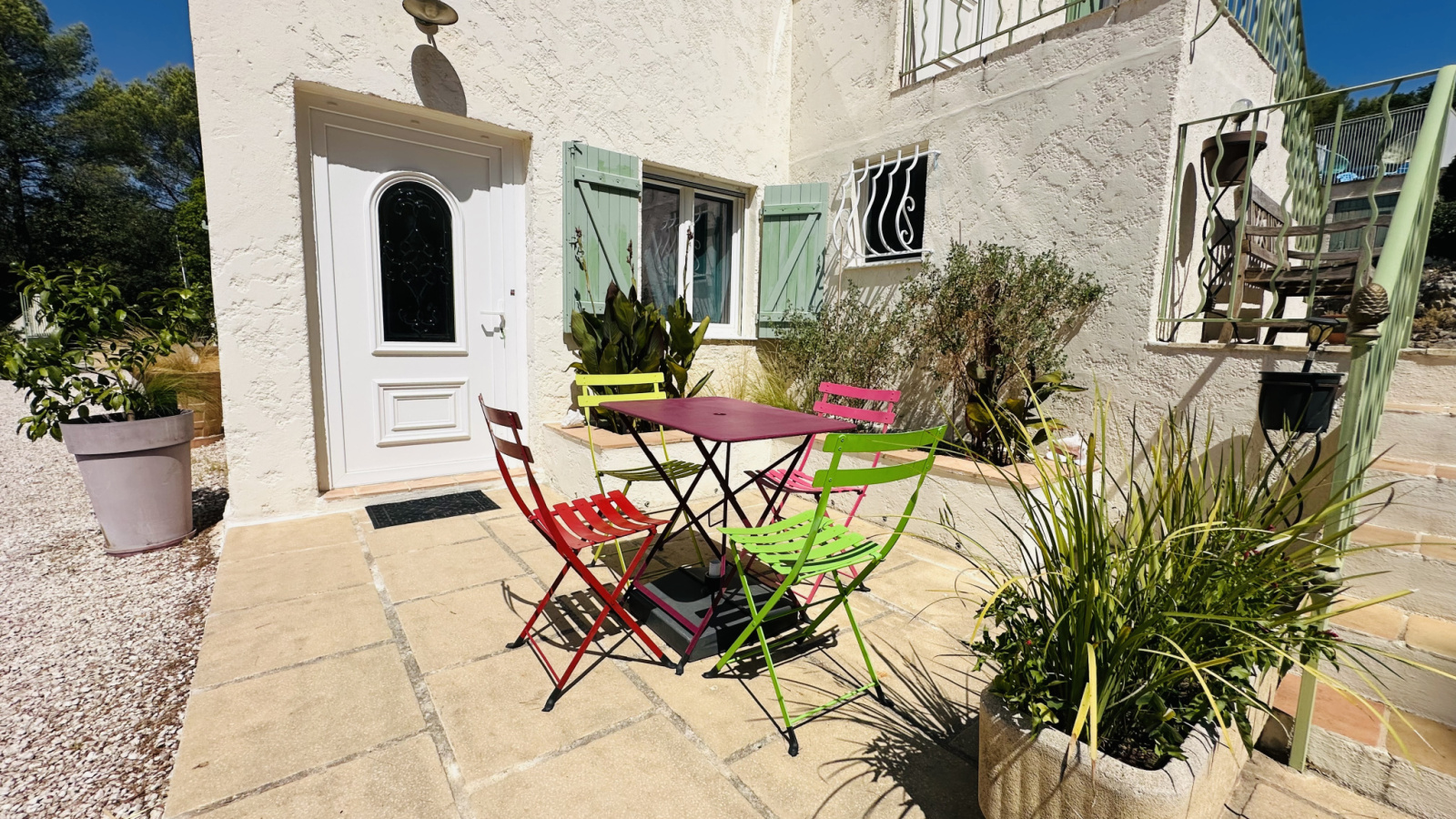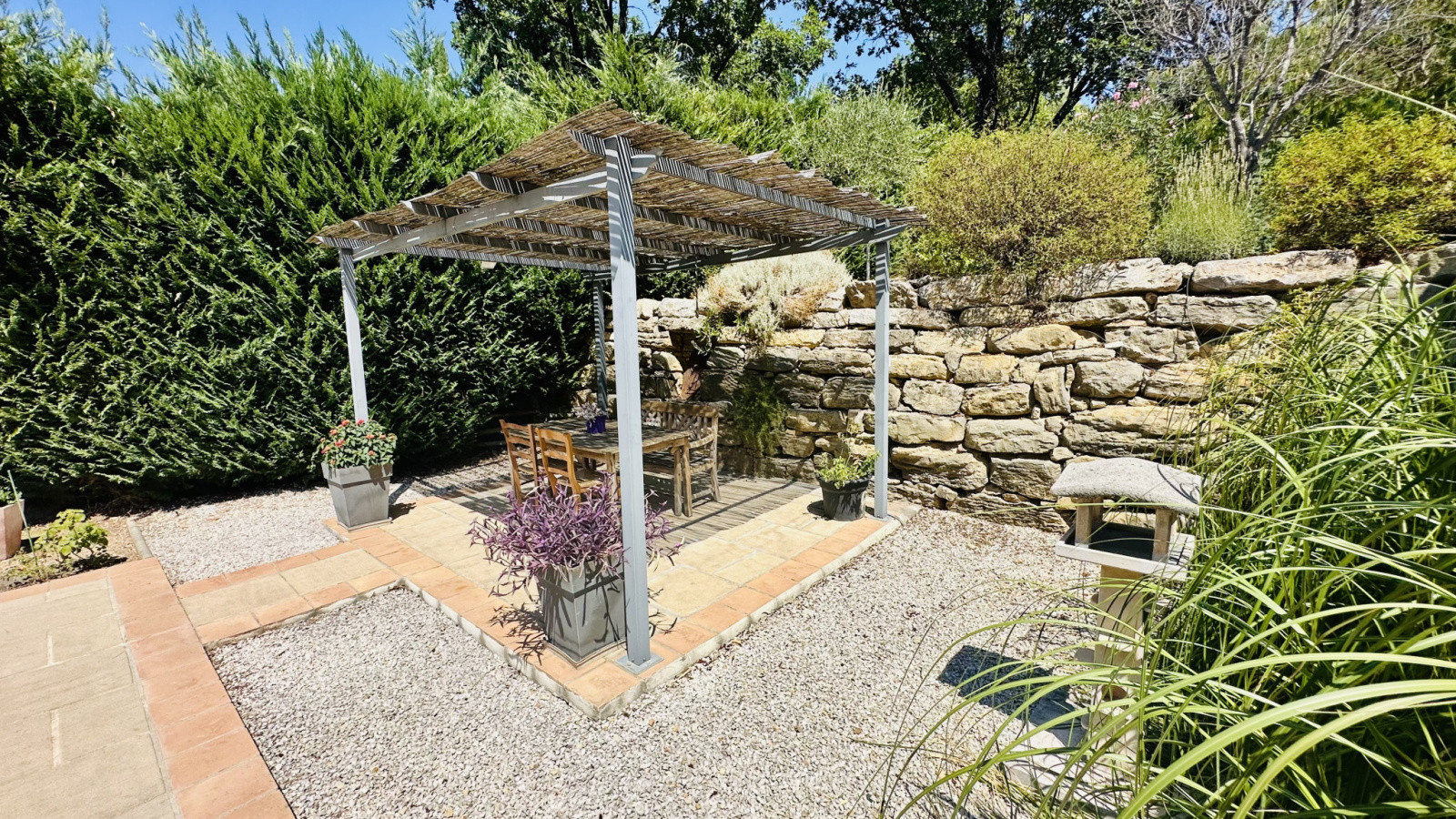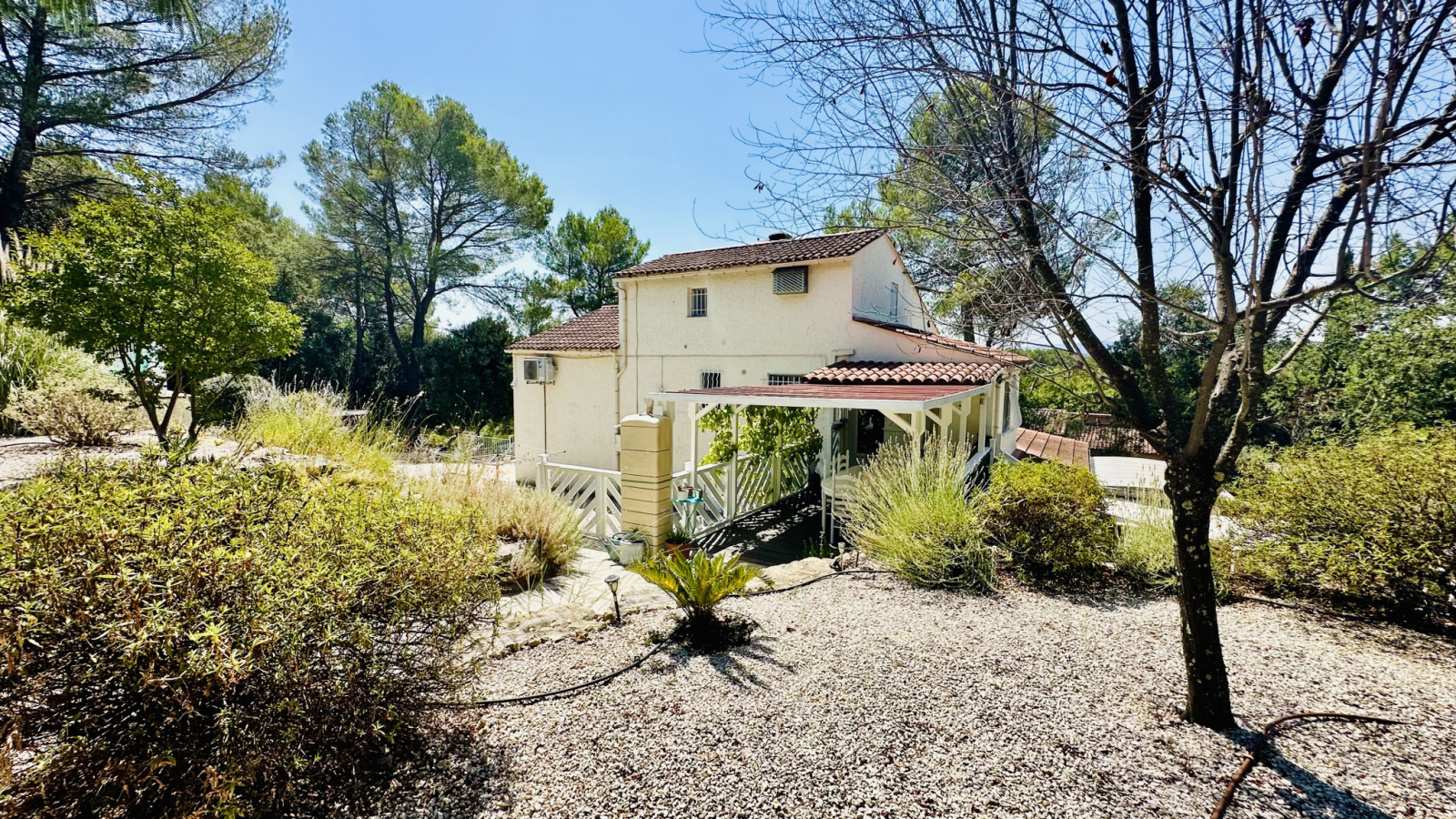 La parcelle, d'une superficie de 1564 m2, offre de beaux espaces paysagers, répartis en restanques aménagées de belles pierres, avec plusieurs places de stationnement gravillonnées, une terrasse à chaque niveau, des rampes au sol pour un accès aisé, un garage, un carport, un portail électrique, un bûcher et un cabanon.