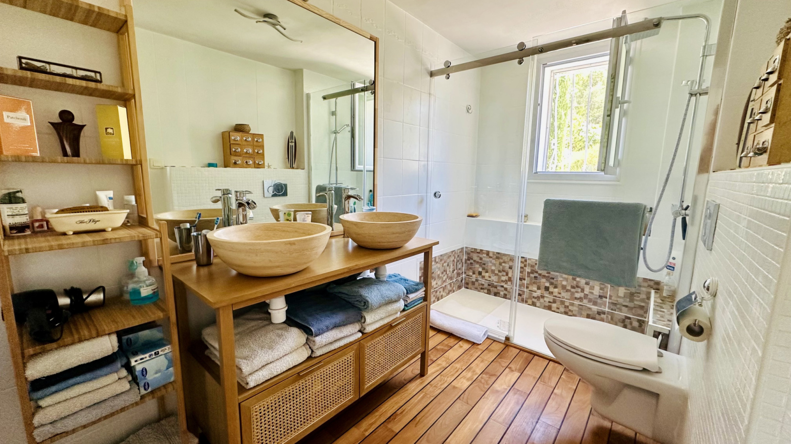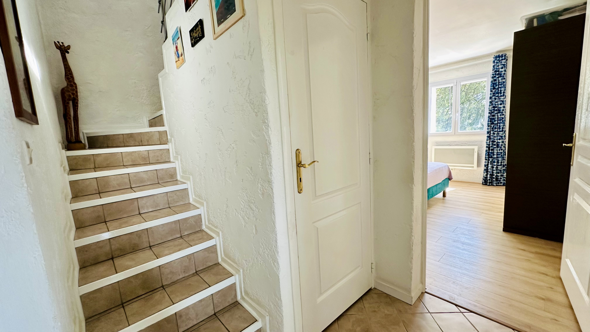 Vestibule desservant une grande chambre de 14,7 m2 avec armoire, une belle salle de douche rénovée, avec parquet exotique (double vasque, WC suspendus), et un espace de rangement.