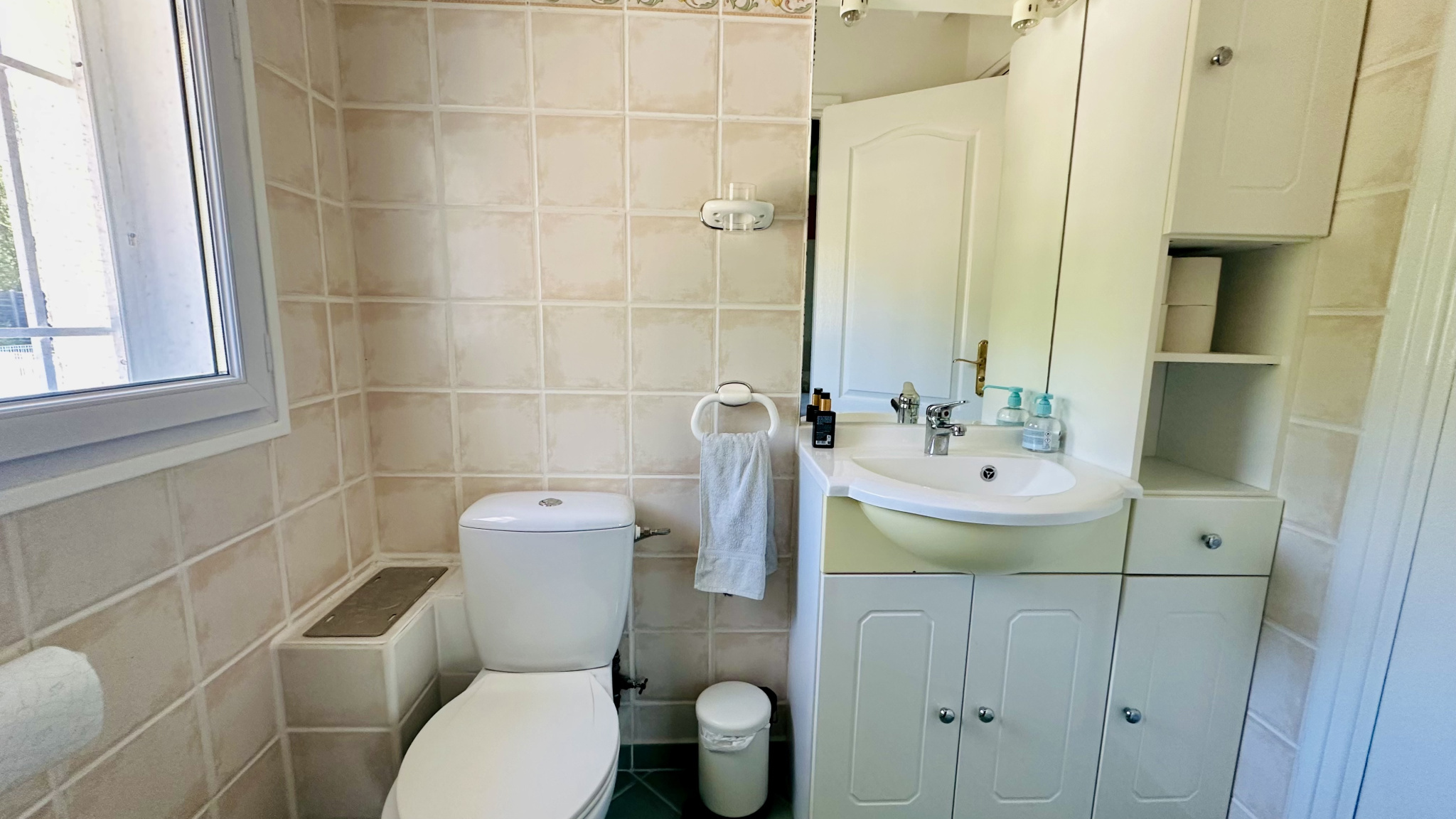 Chambre avec salle d'eau (évier, WC), vaste chambre de 17,33 m2 avec dressing, et salle de douche attenante rénovée avec WC.