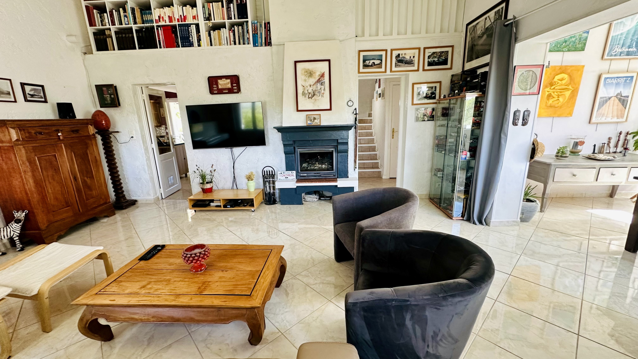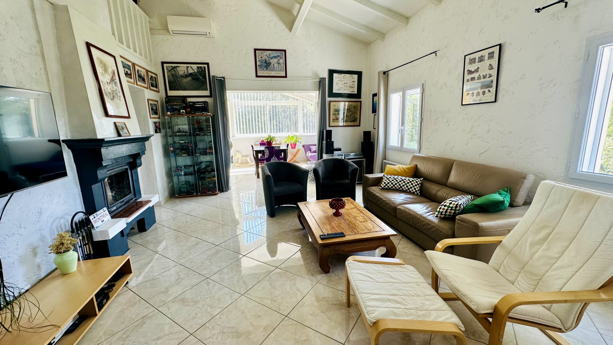 Ravissant salon vitré mansardé, particulièrement lumineux, offrant une vue verdoyante et dégagée, ouvert sur un séjour plein de charme, avec plafond semi‑cathédrale, et insert doté d'un récupérateur.