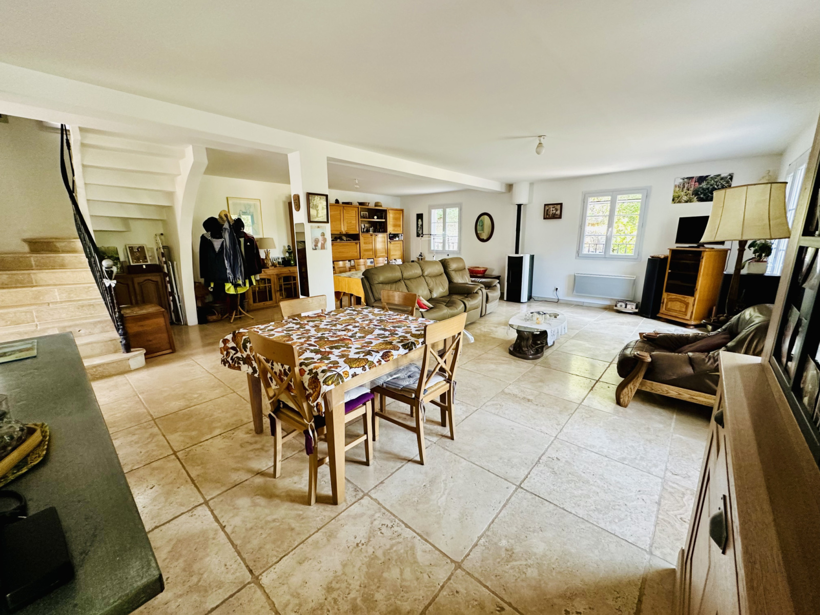 Vous serez accueillis, au rez-de-chaussée, par un hall d’entrée avec WC séparés et lave-mains, desservant un vaste espace de vie de 72 m² comprenant séjour, salle à manger et cuisine ouverte. Ce bel ensemble, équipé d’un poêle à pellets, s’ouvre sur une terrasse intimiste, agrémentée d’une pergola en fer forgé, avec dalles de Salernes, dominant la piscine et le jardin.